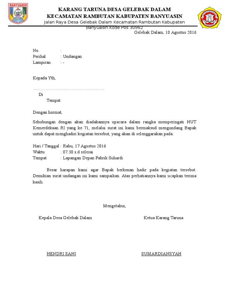 Contoh Surat Undangan Rapat Resmi Organisasi Contoh Surat from contohsurat.co Biasanya karang taruna ini diikuti oleh para anak muda desa setempat dan mengadakan berbagai kegiatan yang berguna untuk desa. Tapi pernah kan kamu mendapatkan sebuah surat undangan? Contoh surat undangan rapat warga dilingkup rt dan rw. Di kantor kecamatan loa janan ilir di kantor kelurahan sengkotek. Contoh surat undangan resmi dapat digunakan agar surat undangan yang kamu buat sesuai dengan penulisan yang baik dan benar. #4 contoh surat undangan organisasi ekstra kampus. Dari kedua jenis surat ini mempunyai tujuan tersendiri dan tidak dapat digunakan di sembarang tempat. Berikut ini cuplikan contoh format surat keterangan kerja dari kelurahan/desa untuk tes pendamping desa (pld/pd/ta) tahun 2021 desa admin kecamatan admin kabupaten admin.